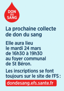 DON DU SANG PROCHAINE COLLECTE A ST BERON LE 24 MARS 2026