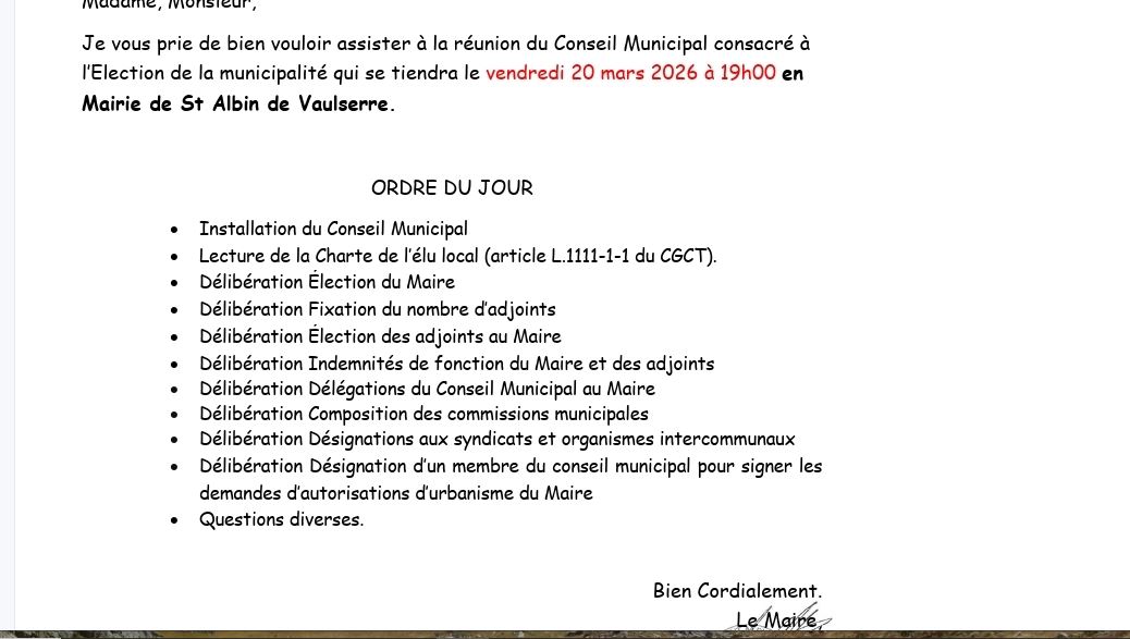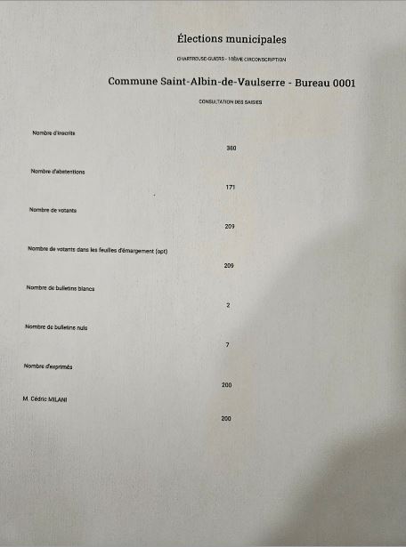 RESULTAT ELECTIONS MUNICIPALES 2026 Voici les résultats des élections municipales 2026 de Saint Albin de Vaulserre Le conseil d’installation aura lieu le vendredi 20 mars 2026 à 19h00 à la Mairie de St Albin de Vaulserre