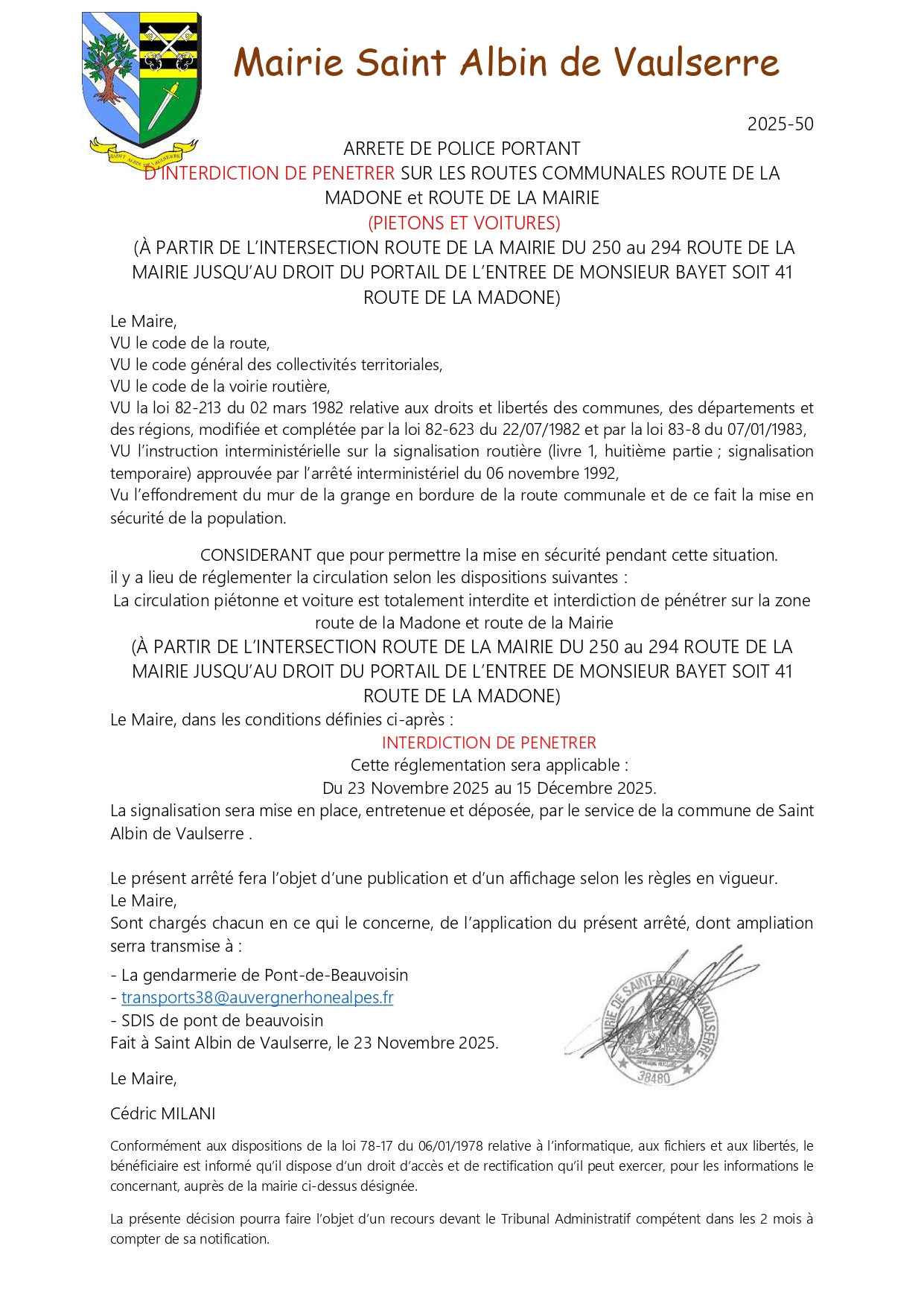 SUITE A UN DEBUT D’EFFONDREMENT D’UN BATIMENT LA ROUTE DE LA MAIRIE ET LA ROUTE DE LA MADONE SONR FERMEES AUX VOITURES ET AUX PIETONS